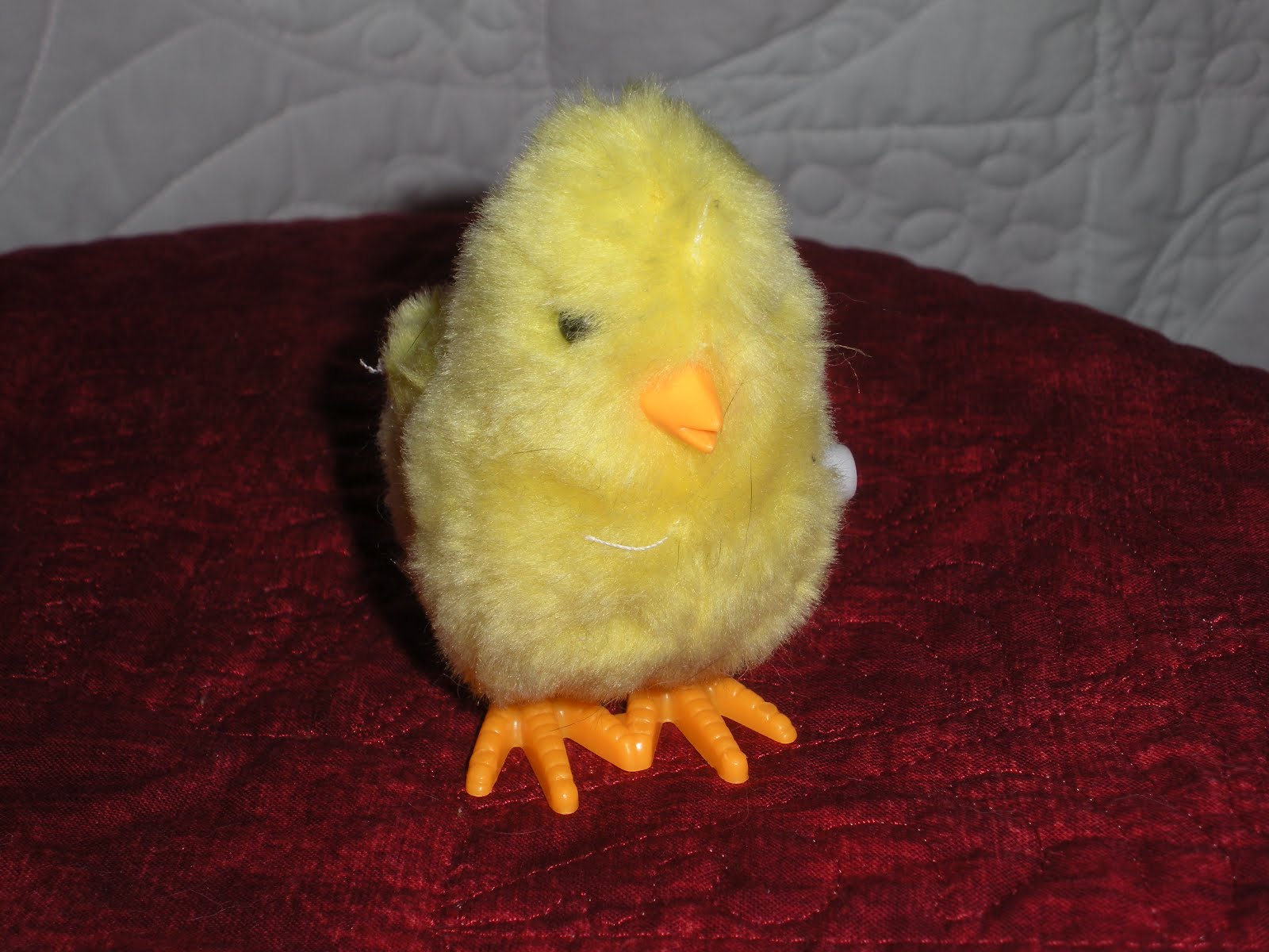 A couple of weeks ago, I returned from an out of town trip to find that mischievous Polly had gotten into the bag of surprises intended for her Easter basket. (Sigh...yes... THE CAT'S EASTER BASKET!) She was having a grand time with this wind-up chick from the $ store.