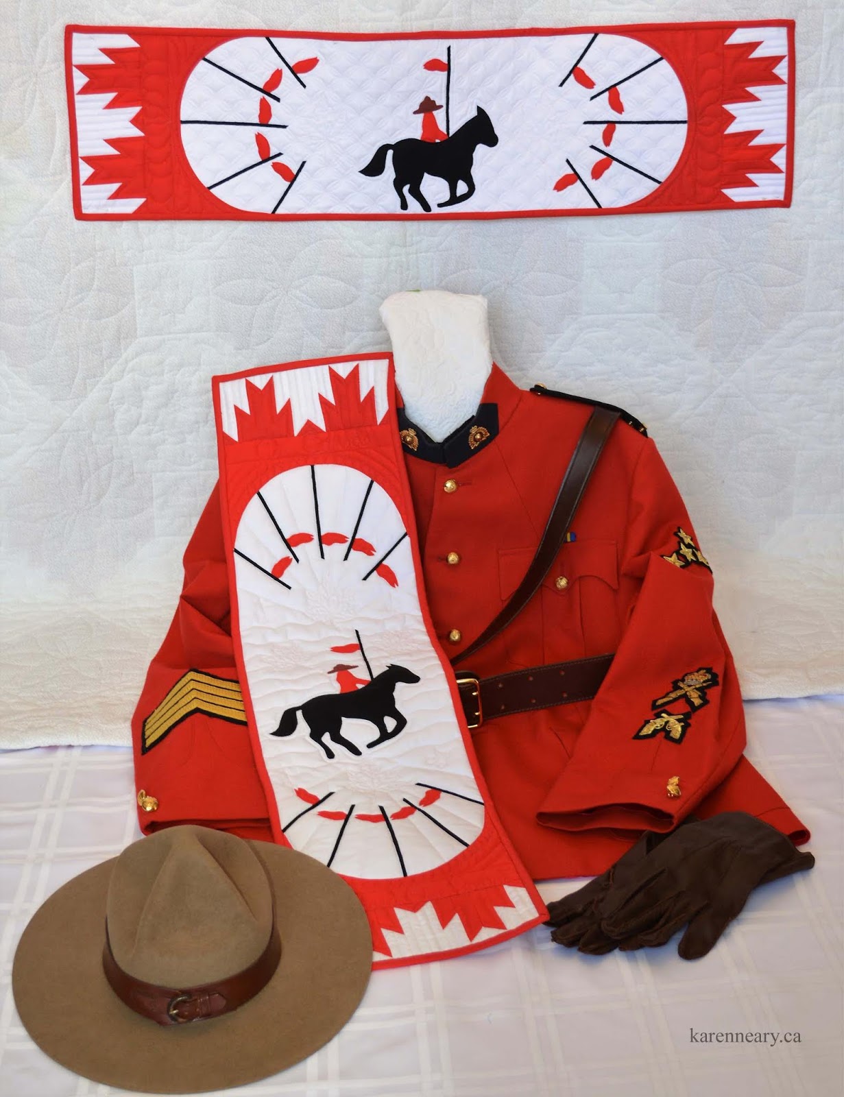 Once I had a rough sketch, it went to Mrs Pugsley's Emporium to see if she was interested. She was, and commissioned me to create the pattern. The next step was to contact the licensing department of the RCMP in Ottawa to see what they thought of the whole idea. I had to sew an actual mock-up of the design for approval. They loved it, and gave their blessing right away. It is important to stress that one cannot simply use someone else's logo or graphics in a quilt design; the images are protected under copyright law. Last year, we applied for and received permission from the Queen to use the Canada 150 logo, and now this year we have permission from the Royal Canadian Mounted Police. Very cool :)